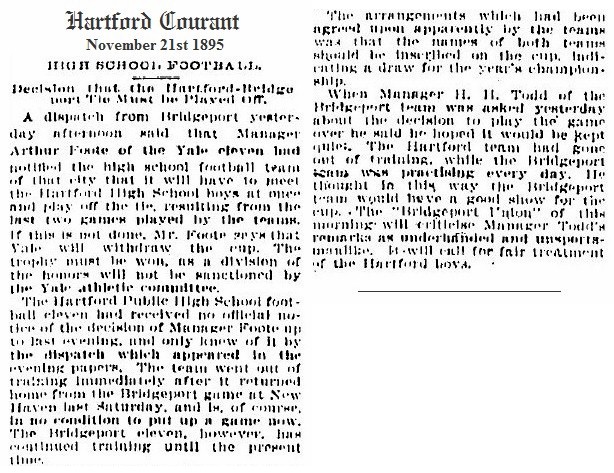 ....."The Yale Cup was also first awarded in 1894, and was awarded annually to the Connecticut State Football Champions until it was retired in 1901 and replaced with the Trinity Cup. The rules of the Yale Cup called for it to be retired to the first team to win it three times. Crosby High School of Waterbury won it in 1899, 1900, and