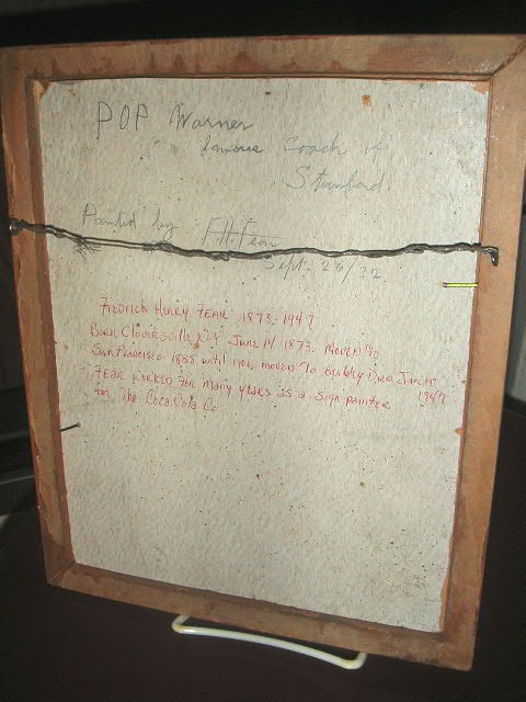 Quite a bit of information, he obviously lived thru the 1906 San Francisco earthquake. We could hardly ask for better background information than this. Quite interesting he worked for Coca Cola for many years! Also it’s interesting he lived in Berkeley, home of the University of California, Stanford’s big game rival, yet for some reason painted Stanford’s coach! The painting measures 10 5/8 inches tall X 8 5/8 inches wide, framed.
