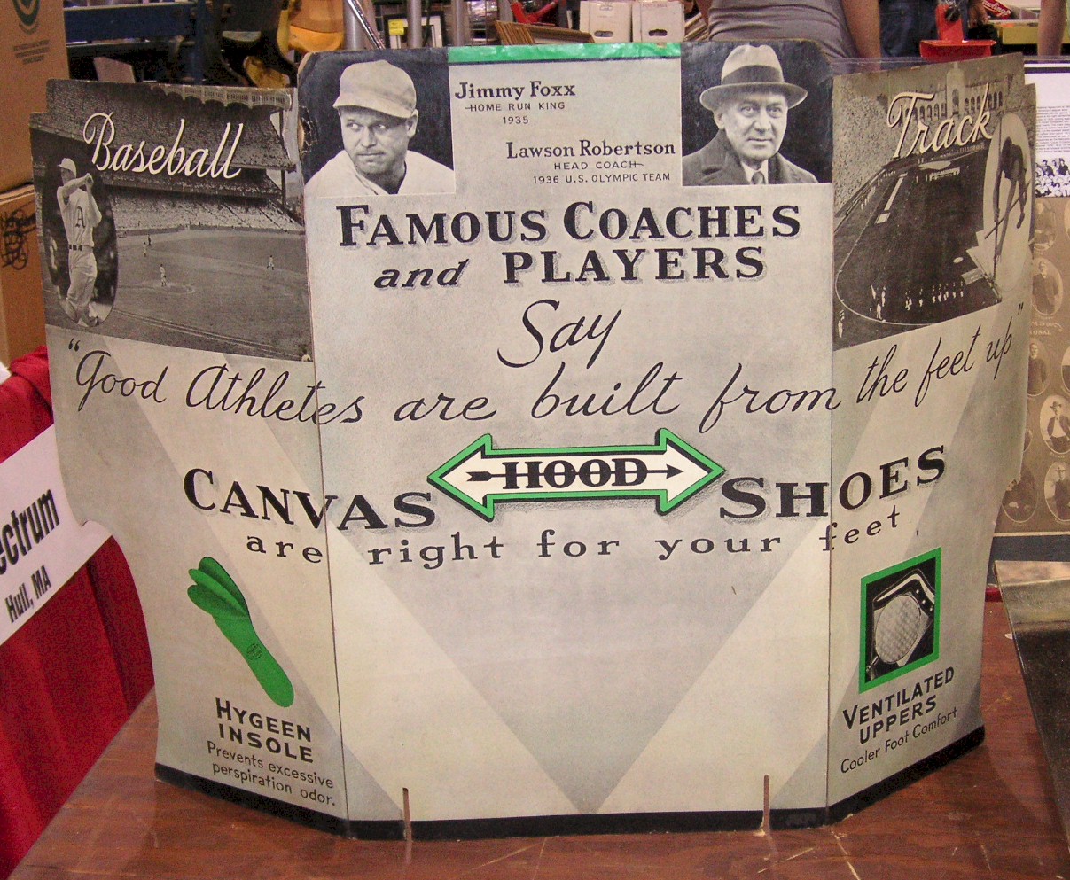 1930’s die cut tri-fold stand up type for Hood shoes with an endorsement photo of Jimmy Foxx, 22 ¾” tall by 35 ½” wide,