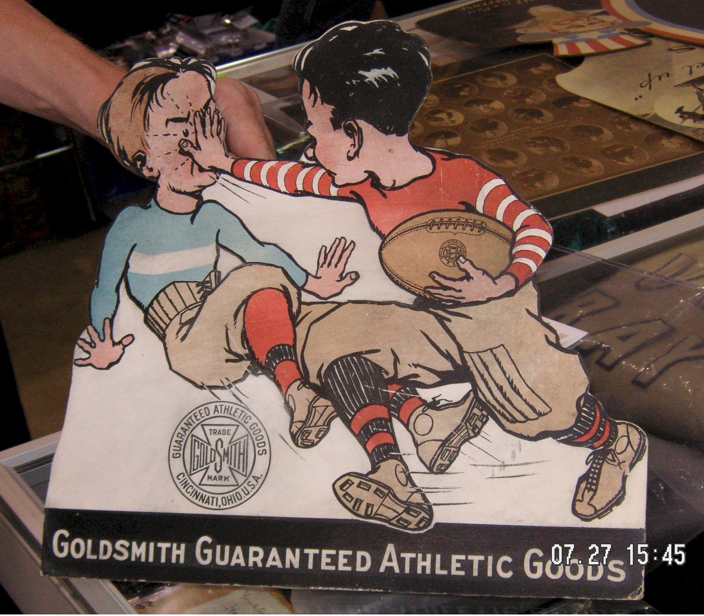 Goldsmith sporting goods sign with football player caricatures, 13 ¼” tall by 14 ¼” wide. His name was Rod Winzinek, from Canton Ohio. He told me he got it there at the National for $350.00.