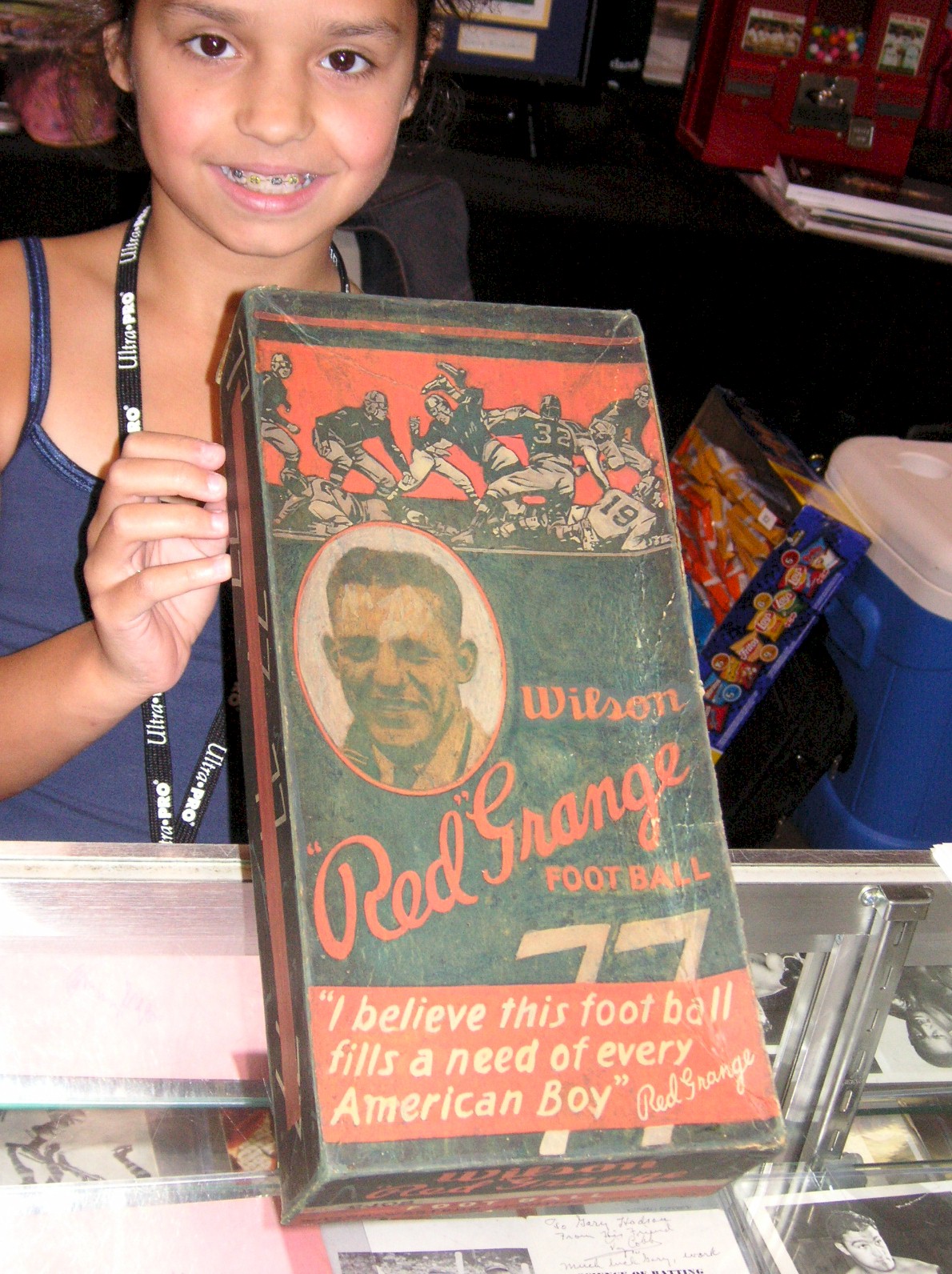 Richard Albersheim from Wynnewood Pennsylvania had an original box that a Red Grange football had come in, worn, as they usually are, and quite rare, 13” long by 6 ¼” wide by 3” tall, $1,500.00.