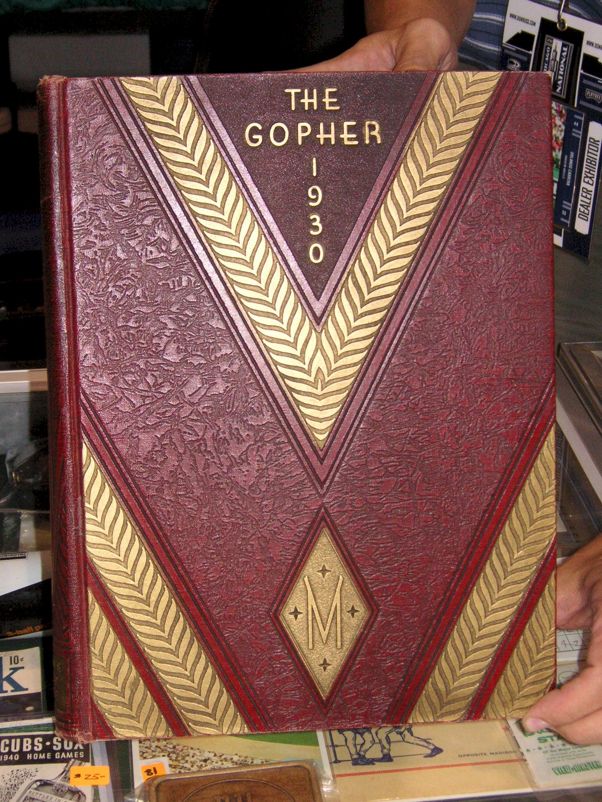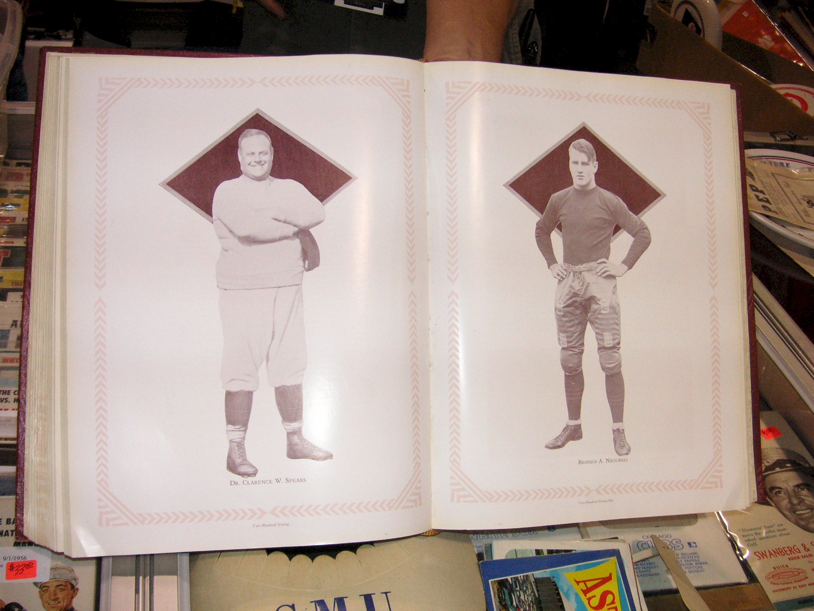 Next up was the booth of Paul Anderson from Minneapolis. Paul had a very nice piece of sheet music called “The Gridiron March Two Step”, that had a large illustration of a helmet-less football player running with a ball, printed in blue, 13 ½” tall by 10 ¼” wide, $35.00. Next Paul had a 1930 year book of the University of Minnesota, the Gopher, which had a full page photo of Bronko Nagurski in football uniform when a student there, $125.00