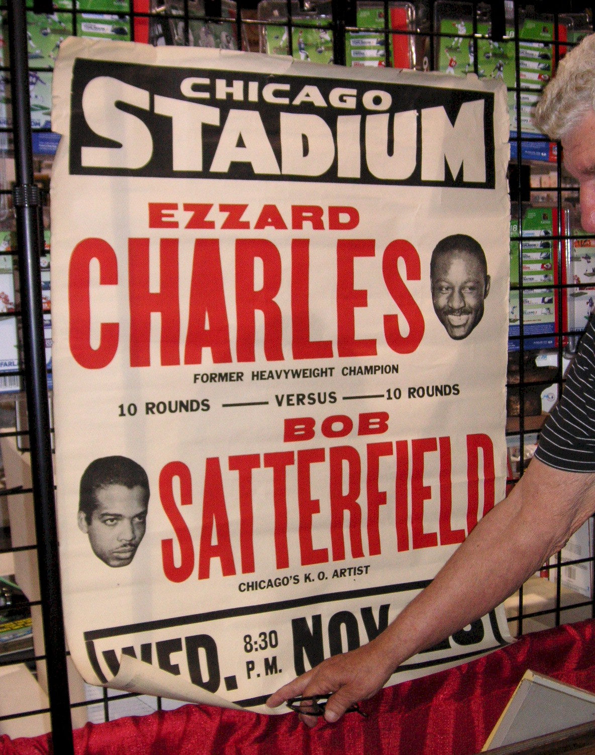 Louis Bollman from Lemont Illinois had a c1952 boxing site poster for an Ezzard Charles vs. Bob Satterfield fight in Chicago, 35” tall by 28” wide, $300.00
