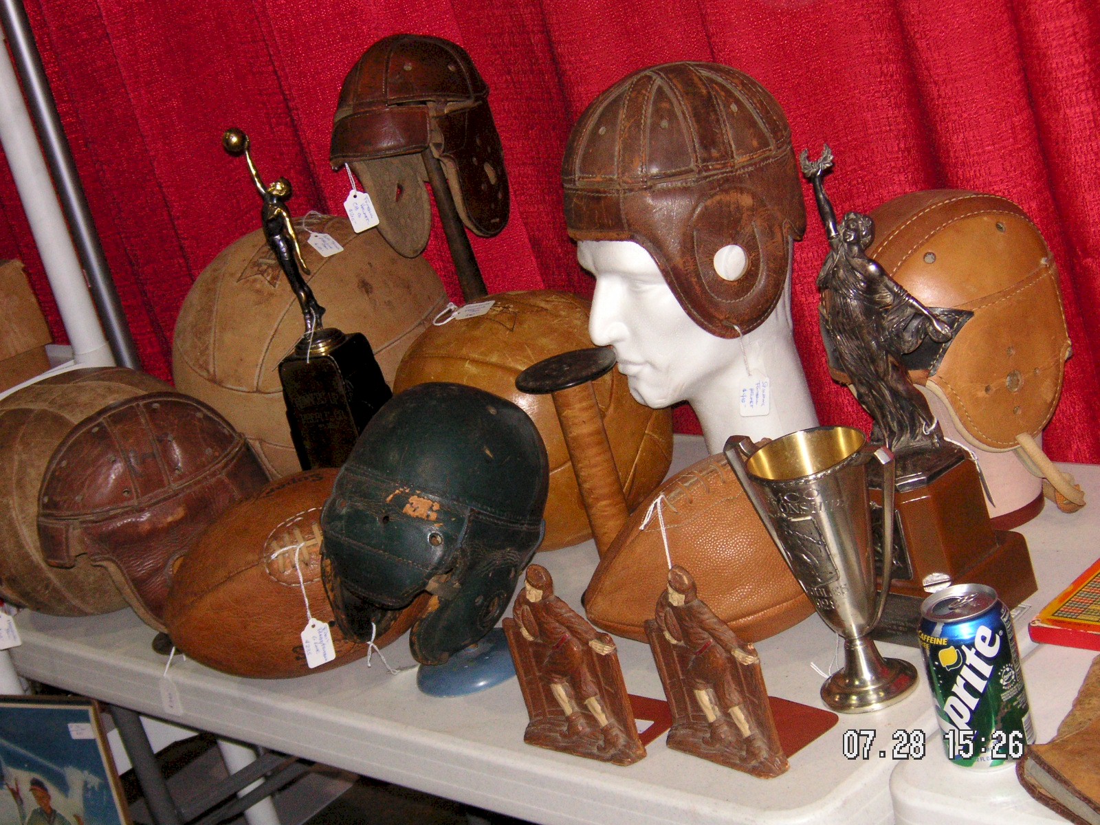 As we begin to wrap this up, I'll mention my one purchase. That would be the 4” wide by 3” tall statue of a football game action scene, that Kevin Bronson had. It was one of the first things I saw when I came in on Wednesday, and he wanted $550.00 for it then. By late afternoon Thursday I'd pretty much seen everything and went back to see if he still had it. Kevin was gone from his booth, but I could see it still in the case. Always the cautious buyer, I walked around contemplating just a little longer, figuring I had at least till he came back to decide. Wouldn't you know it....I walked back and there was a young couple looking at it. I just stayed out of it and took another walk. I came back after the couple left and it was still there, but Kevin was gone again. His neighbor called him on the radio, and got me a quote of $500.00. Kevin showed back up and I offered $450.00 and he took it. I'd seen one other example quite a while back. I think it was in an ad in Sports Collectors Digest maybe ten or twelve years ago. If I recall it was around $300.00, and already sold when I called on it. This may even be the same one. As for the piece it's self, it's pretty unique, I've never seen anything quite like it. Very miniature. And of course, antique sports sculpture is my hot button so it was a nice find.