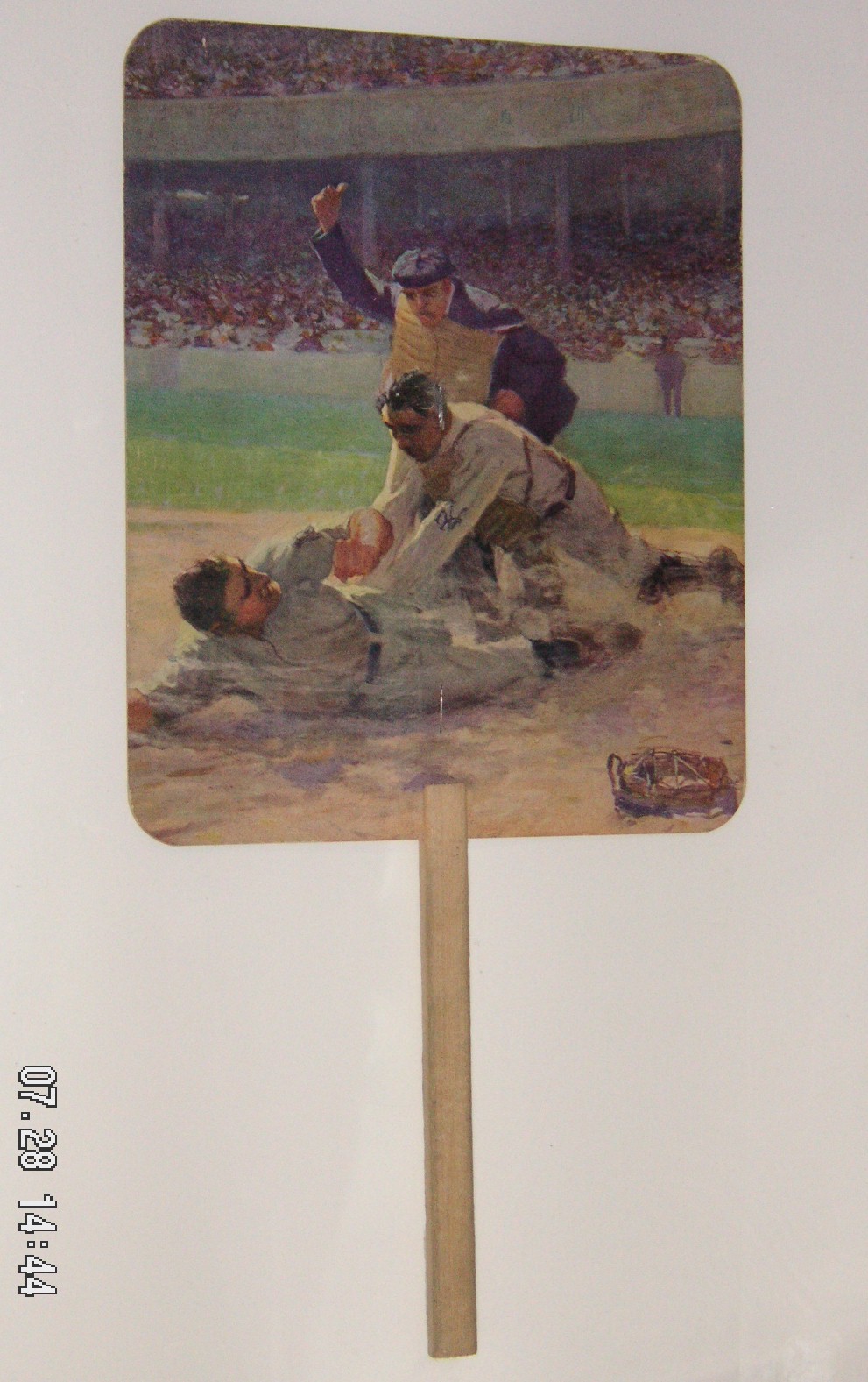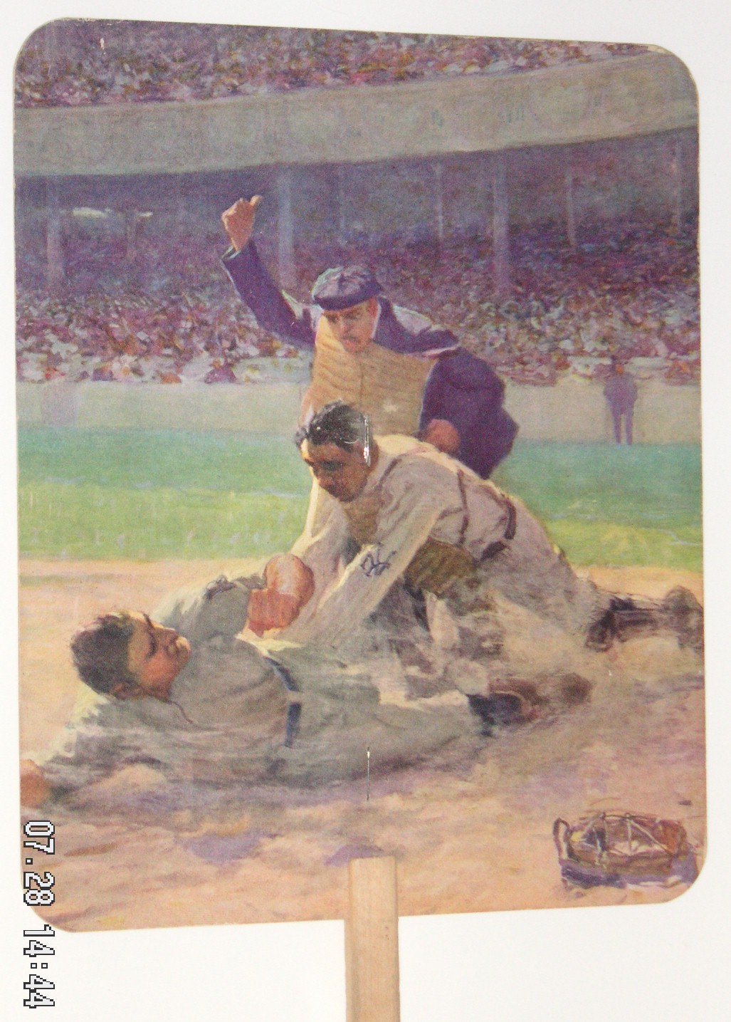 I had the pleasure of finally meeting fellow collector Mike Hoevet, while I was in Kanuit’s booth, as we’d only emailed till then. Mike, who is from Ann Arbor, got a real nice paper fan from Kanuit. It had an impressionistic illustration of Honus Wagner of the Pittsburgh Pirates sliding into base, being tagged out by Chief Meyers of the New York Giants, really nice condition, 14” tall by 7” wide, paid $150.00