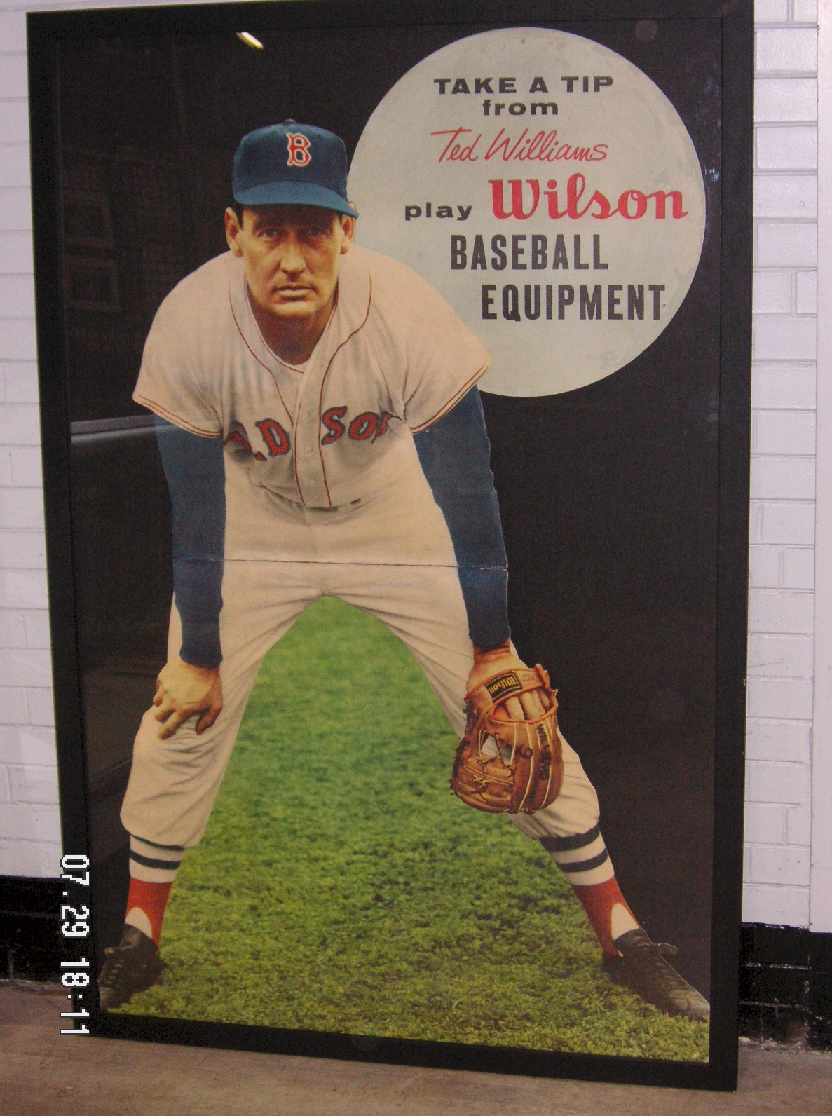 The last thing I saw at the show was one of the most spectacular. It was Friday, my last day there, and the convention had just closed. I was getting ready to leave when Herman Kaufman told me about a huge die cut sign of Ted Williams, advertising Wilson baseball equipment, that him and John Liffmann had sold. Gilbert Porter of Harvey Horseradish & Company from Crugers New York, had bought it. Everyone was covering up there booths, so I ran over quick as I could to Gilbert’s booth to see it. I barely made it, as you can see from the time stamp on the photo. I took it at 6:11PM, eleven minutes after the convention closed. 5 foot tall by 38” wide. Gilbert wouldn’t divulge what he paid. It was a good way to end the convention.