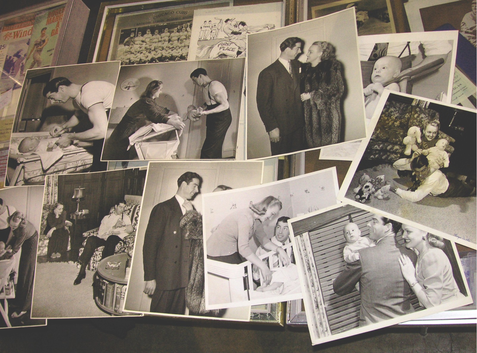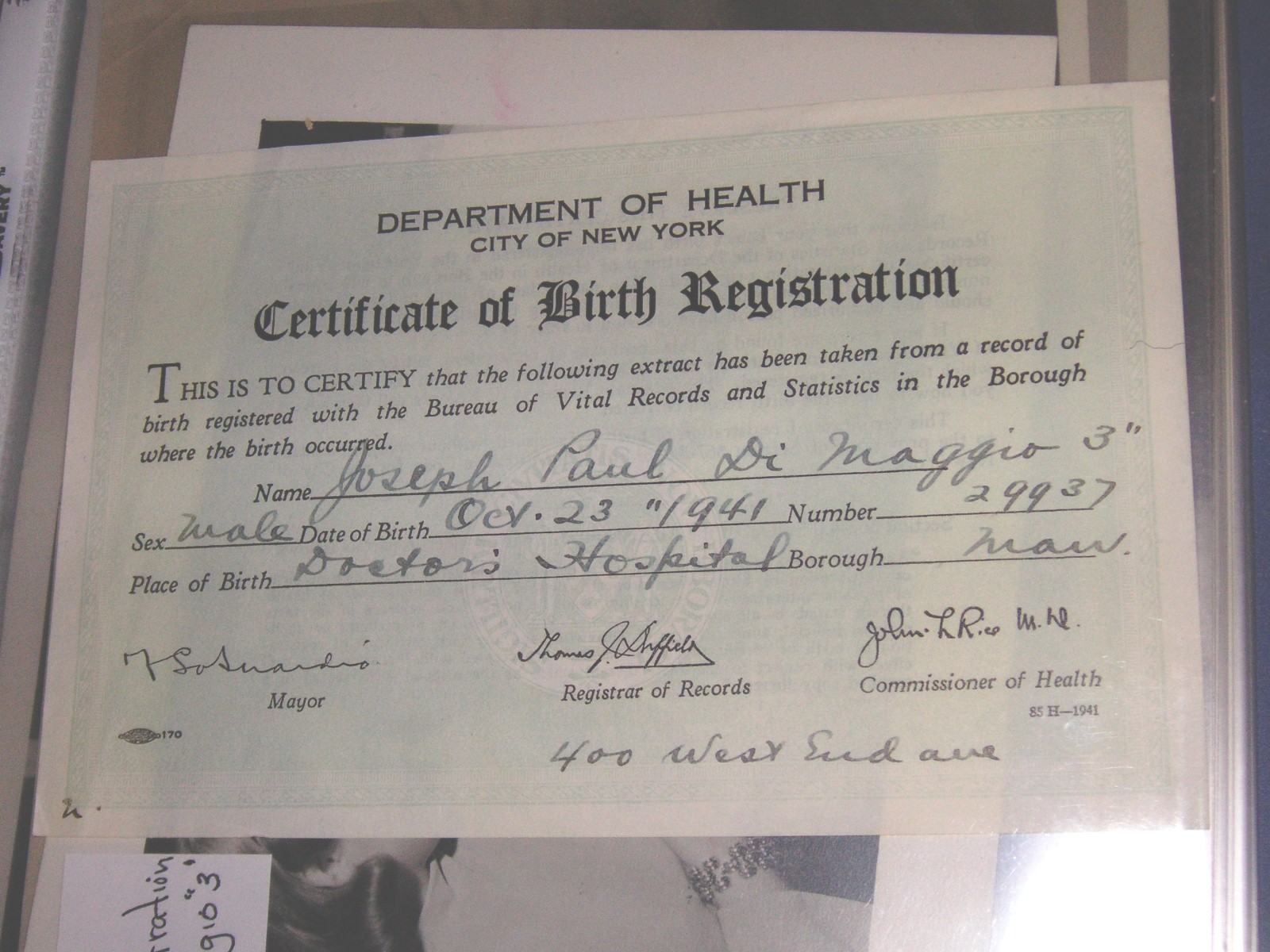 Next was the booth of Bill Rosenthal of Rockville Maryland. Bill had a ton of photographs of Joe DiMaggio that he told me were from Joe DiMaggio’s estate. They weren’t the usual DiMaggio photos. They all seemed to be personal effects of the Yankee great. Many were snapshot type photos, and many were of him and his first wife Dorothy Arnold, I believe. There was one of Joe D. holding a baby in his arms, which was probably his son Joe Jr. born in 1941. That photo was especially spectacular because it not only showed him in a very personal moment, but he was wearing a short sleeved tee shirt and you could clearly see his ripped biceps while holding his son. And there were some that looked like him and Dorothy out in night clubs with friends. One photo showed him playing tennis. Some he was smiling, some not. There was a photo that looked like it was probably his parents. I asked Bill, and he said they were. Then there was his son Joe Jr’s birth certificate, plus many other photos. They all seemed like originals, not copies, and, frankly, it was a little strange looking thru them. Like you were looking thru his personal things, a bit eerie, knowing he was such a private person. I met him once. You can read that story by clicking here. The photos ranged in price from $200-$300 for the larger ones, and $50-$200 for the smaller. The birth certificate was $400.00.