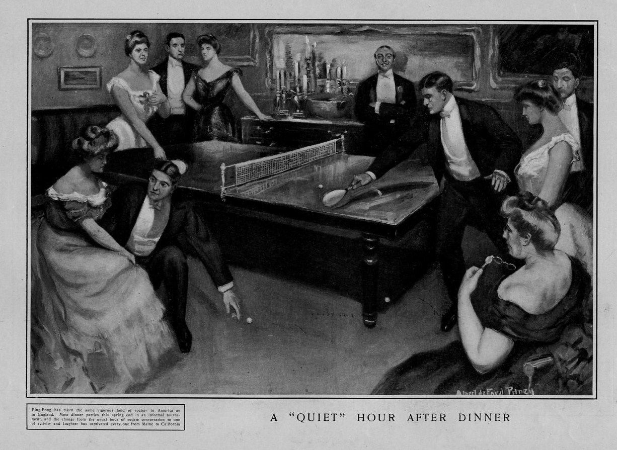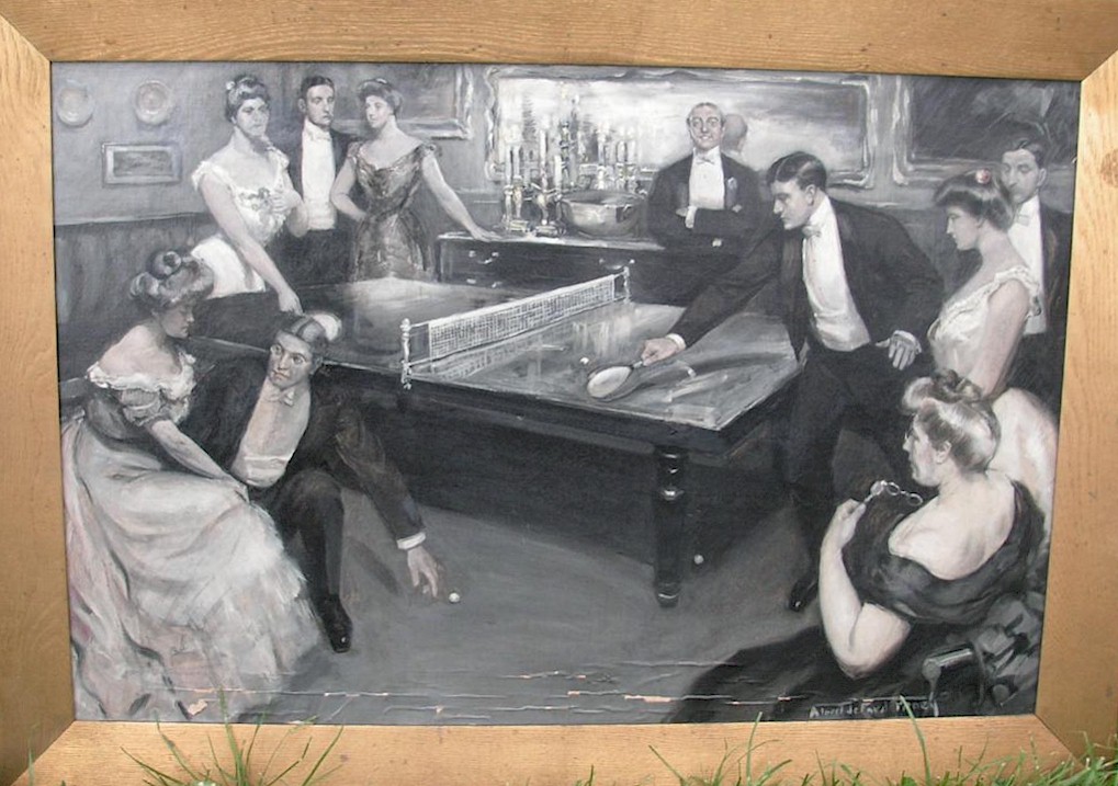 You can view the painting in our collecting magazine: http://www.ittf.com/museum/TTC62.pdf . Note that the article that followed was about yet another similar illustration of the time, which I happened to use for the cover of my 2012 book. A number of similar illustrations were seen in U.S., London, Paris and Italian magazines, books and newspapers, all in 1901-1902 when ping pong was a huge craze led by "high society." Naturally these are all well known to us serious collectors, from eBay, from our collecting magazine, and from the ITTF Museum website.