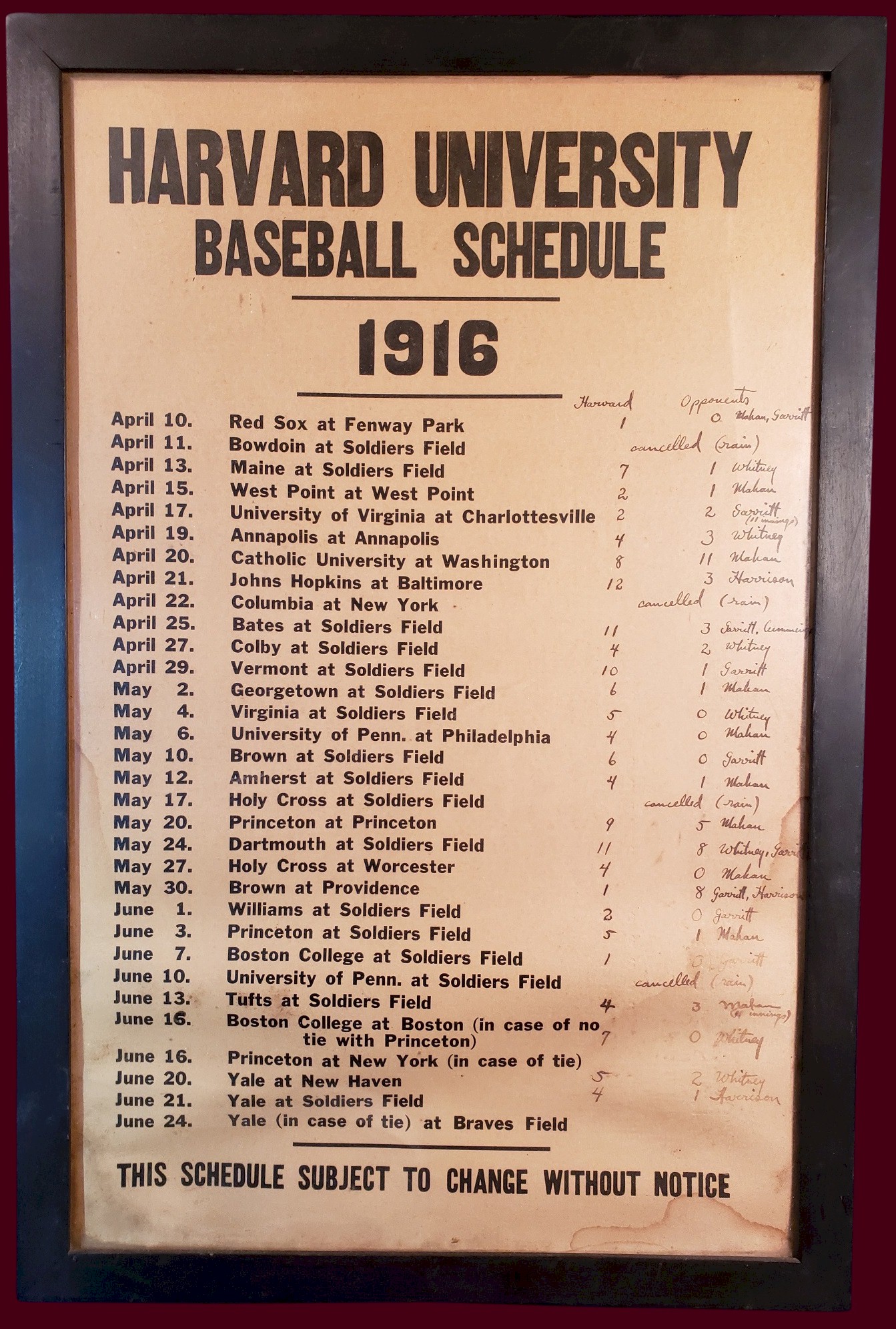 First let's back up where we first met...I picked up this exceptional poster on eBay in June 2022...It would be considered a broadside. I was impressed from the get-go; I had never seen a college baseball poster from the teens quite like it. It came untouched in its apparent original frame with wavy glass. Remarkably bold and to the point, no graphics...yet striking nevertheless...Someone, likely a Harvard undergrad, wrote in the scores by hand...obviously an avid Harvard fan...Or possibly it belonged to a team member!...Bill Rayburn of "The Three Bills" fame took the words right out of my mouth when I showed it to him...said he'd never seen anything like it...Confirming my initial impression...But more than just a slice of Harvard life 1916...the poster gets more interesting...Come along on the journey....First though I'll clarify we'll only focus on one game listed on the poster....The first one...Harvard versus Red Sox April 10th...