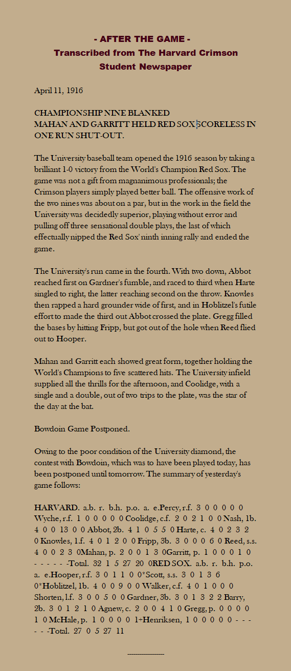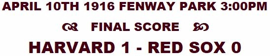 A little know fact is Harvard played in the first ever game at Fenway Park on April 9th 1912 against the Red Sox, losing 0-2. The following year Harvard again played the Red sox on April 8th 1913, losing 0-5. In 1914 Harvard did not play a pro team. In 1915 they played the Boston Braves on April 12th, losing 3-7...Then of course the 1916 Harvard vs. Red Sox game we examine today.