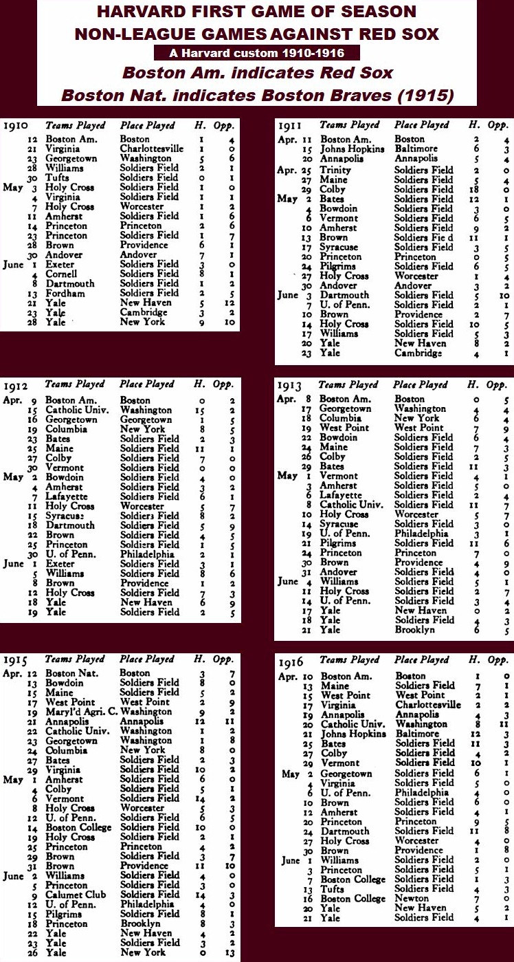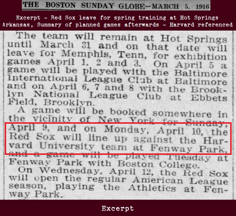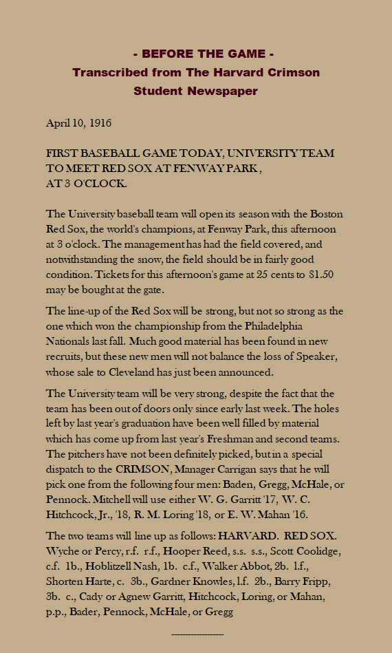 Harvard playing the Red Sox was interesting in it's self...college vs. pro...But there was more to it...The Red Sox were the world champions then...they won the World Series in 1915 against the Philadelphia Phillies...Obviously playing Harvard was a non-league warm-up for the 1916 season...and a preliminary non-league game for Harvard...Please note that playing the Red Sox for their first game of the season was a custom of Harvard's from 1910 to 1916.