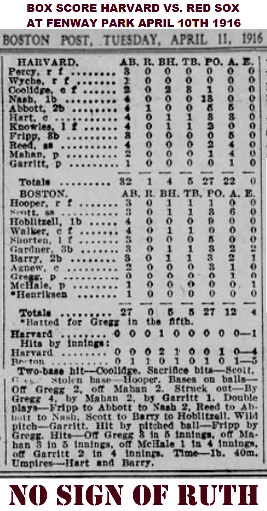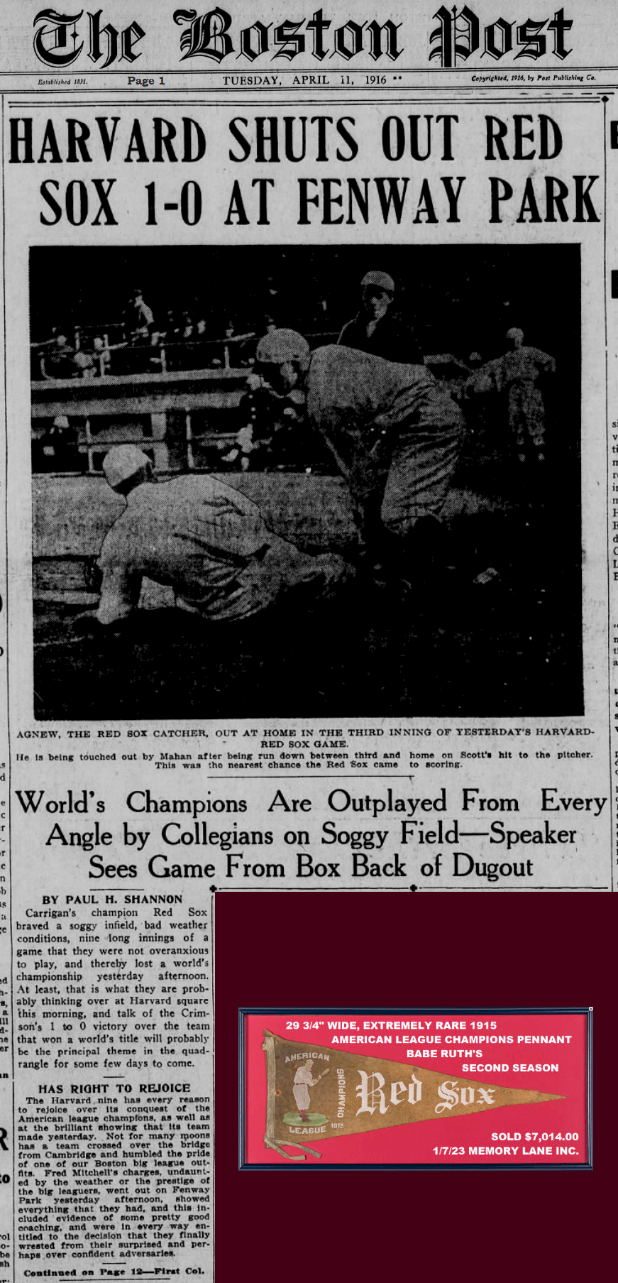 arvard University Varsity played the Boston Red Sox on April 10th 1916...The game is listed on the poster above as the first of the season. That's Fact 1...Fact 2. Babe Ruth played for the Red Sox from July 11th 1914 to January 5th 1920. That would be the most basic take on this poster you're about to read, but let's take a closer look...