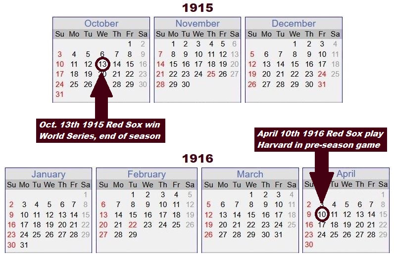 Ruth playing against a college team isn't too far out...Ruth playing against Harvard is a little more interesting...Harvard had a reputation as an elite place children of privilege went...children of wealthily influential fathers, groomed at elite prep schools...Ruth's dad owned a bar...Ruth had been in a reform school for twelve years because his parents couldn't handle him...Baltimore's St. Mary's Industrial School for Boys...We can only speculate what his thoughts were about playing them...and why he apparently didn't play. The best we can do is try to analyze the time-line of what he was doing for the six months between the end of the 1915 season after winning the World Series on October 13th 1915....and April 10th 1916 when the Harvard game took place