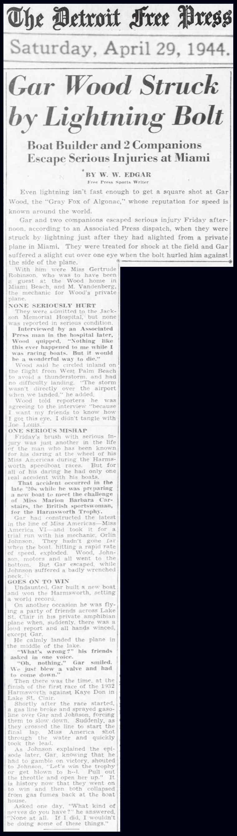 story for the papers to print…but I didn’t care for it all…So then I’m reading his bio on coachbuilt.com and I read where ľ thru his life he got struck by lighting and lived on April 29th 1944…two others with him were also hurt…Then ten years later on May 14th 1954 his