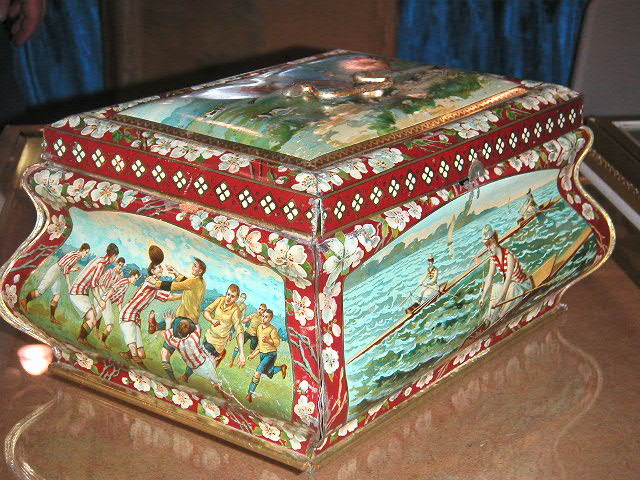 back, a scene of snow skiers and sleders on the right side, and a…hold on, let me go look….English fox hunting scene on the lid, 12 ľ" wide x 6 ˝" tall, price: $400.00