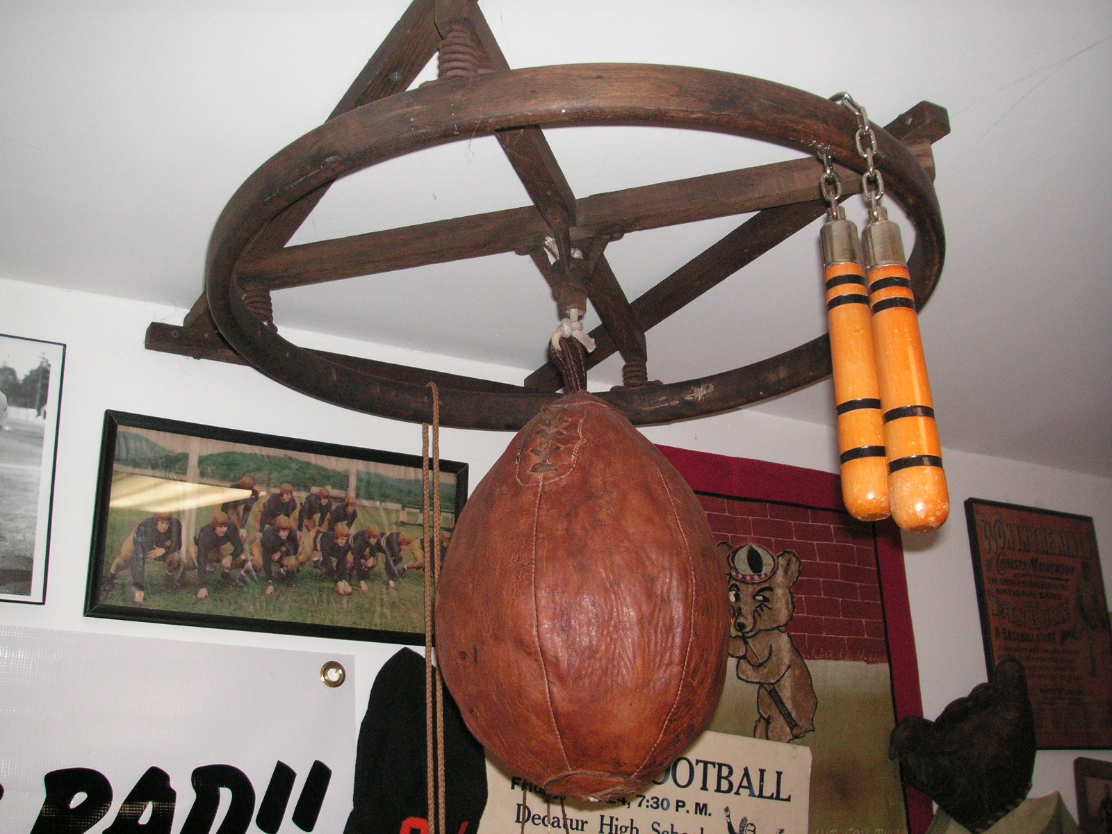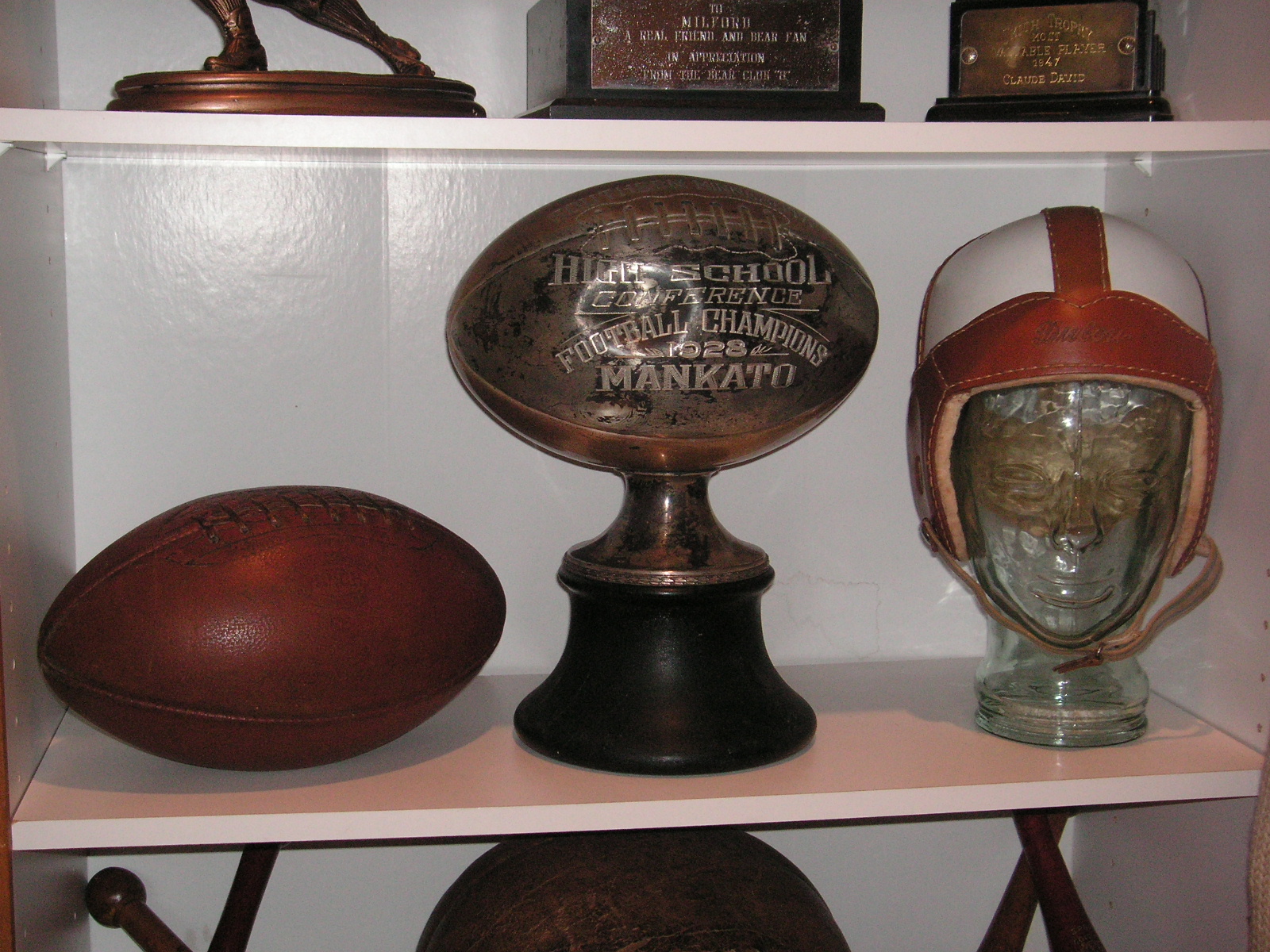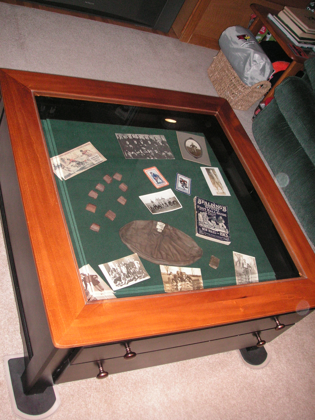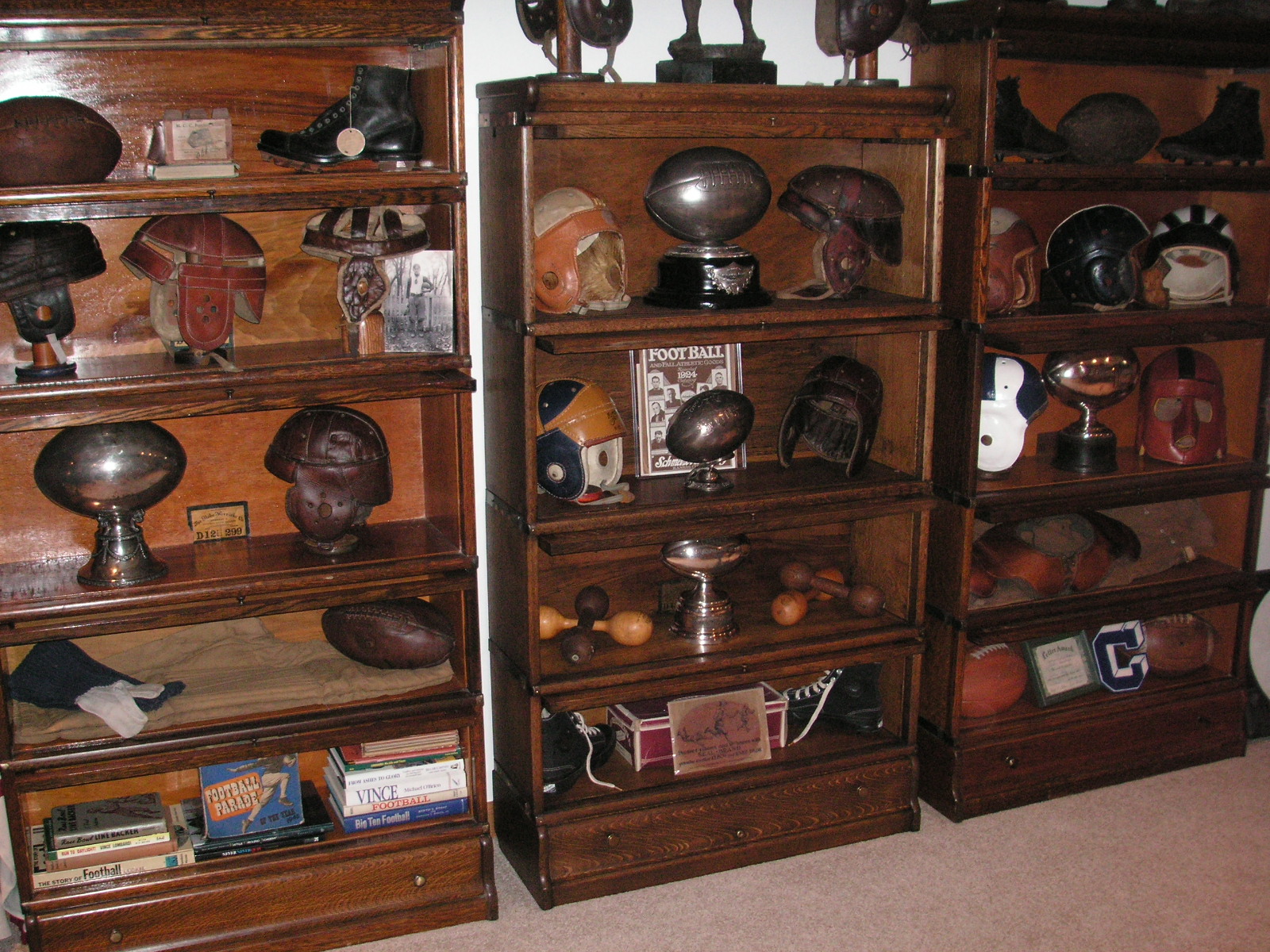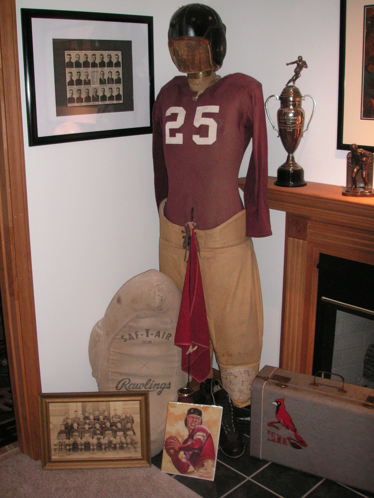 "I've been collecting vintage football items for about 13 years. I started by just wanting 1 leather football helmet. Loving the game of football so much as a player and coach, I was intrigued with the roots of the game. I searched every antique shop I came to with no luck for over a year. My parents found 2 old 1940's leather helmets at an antique shop in Wisconsin and bought them for me for Christmas 13 years ago and that was the start of my obsession. I enjoy having a nice assortment of items that span the decades the game has been played. I often wish I could go back and talk to the men who used to
