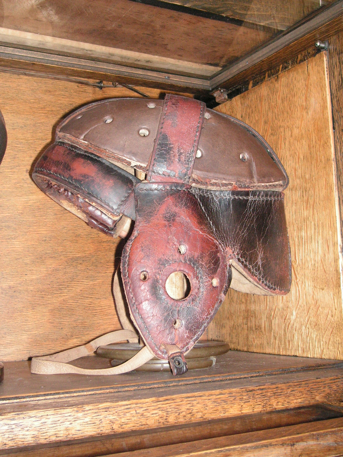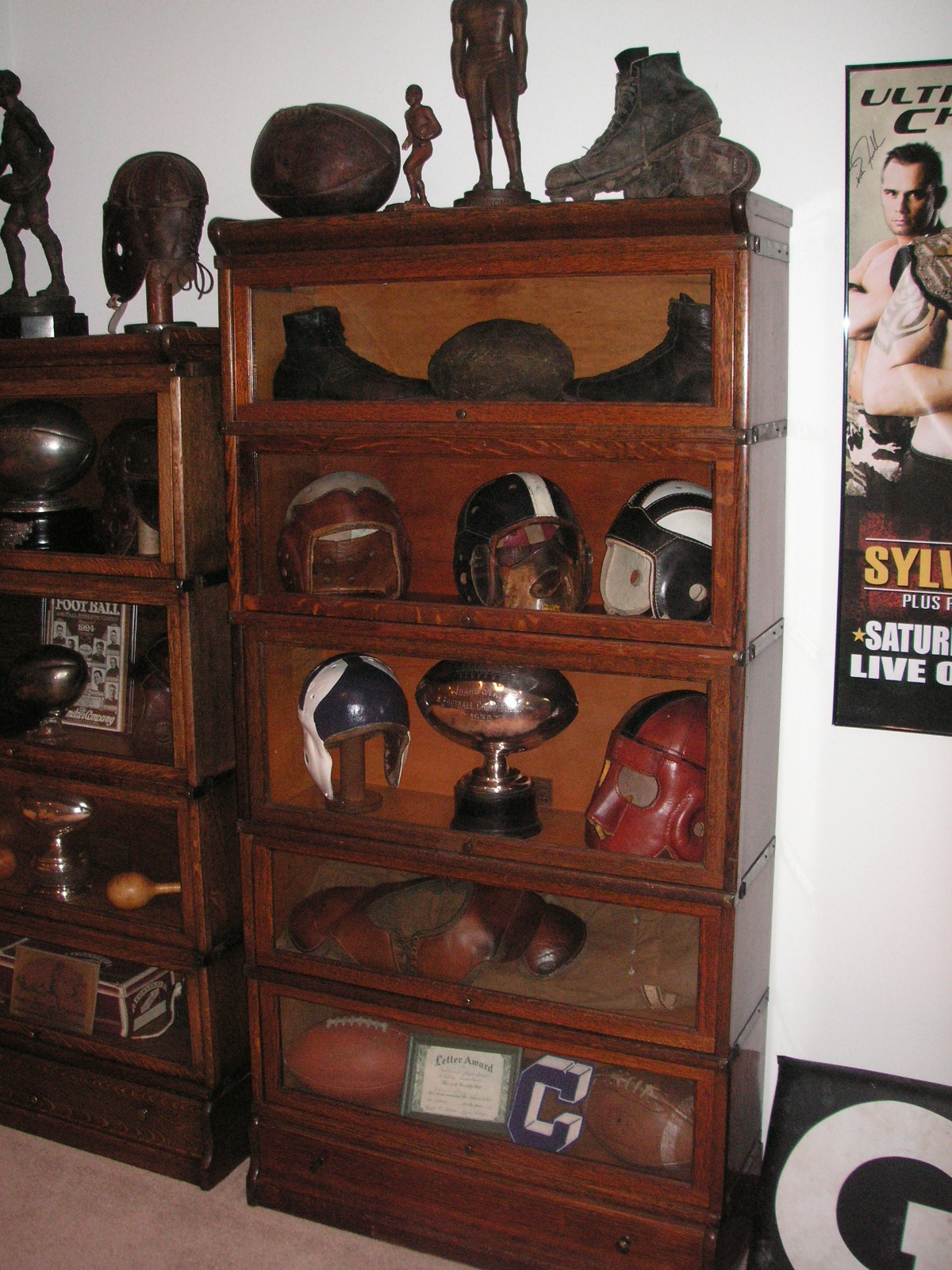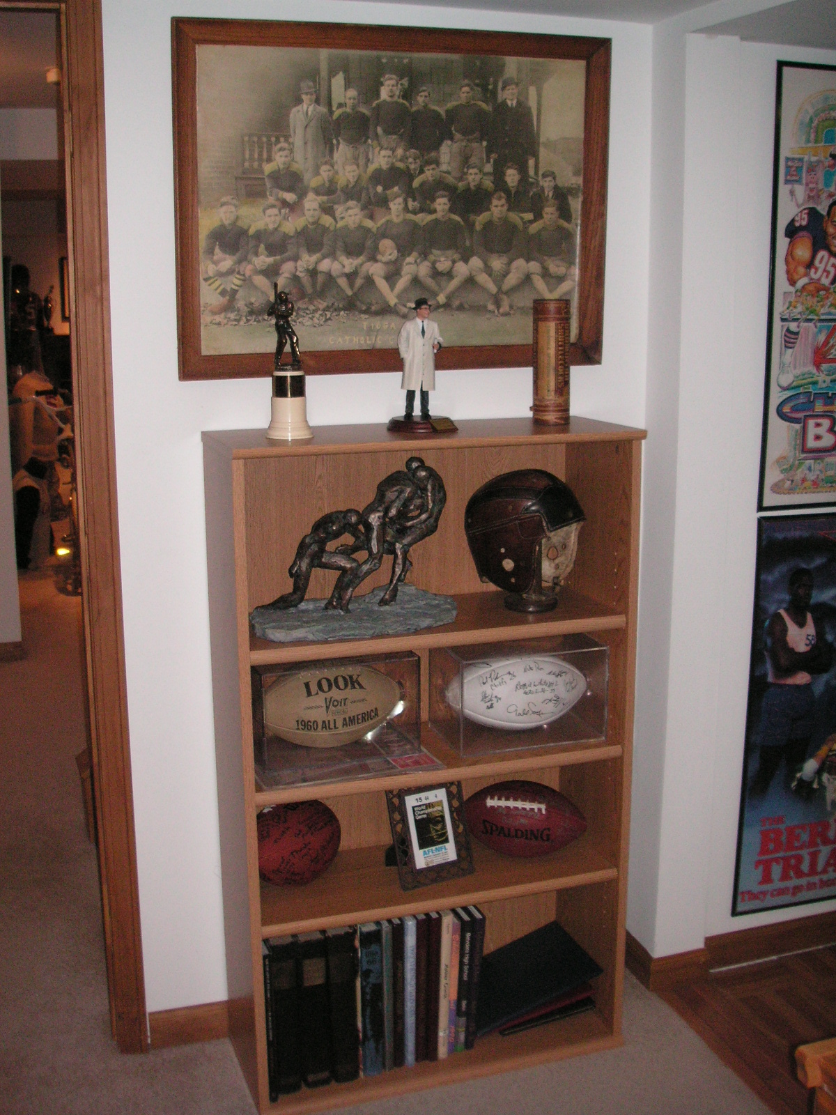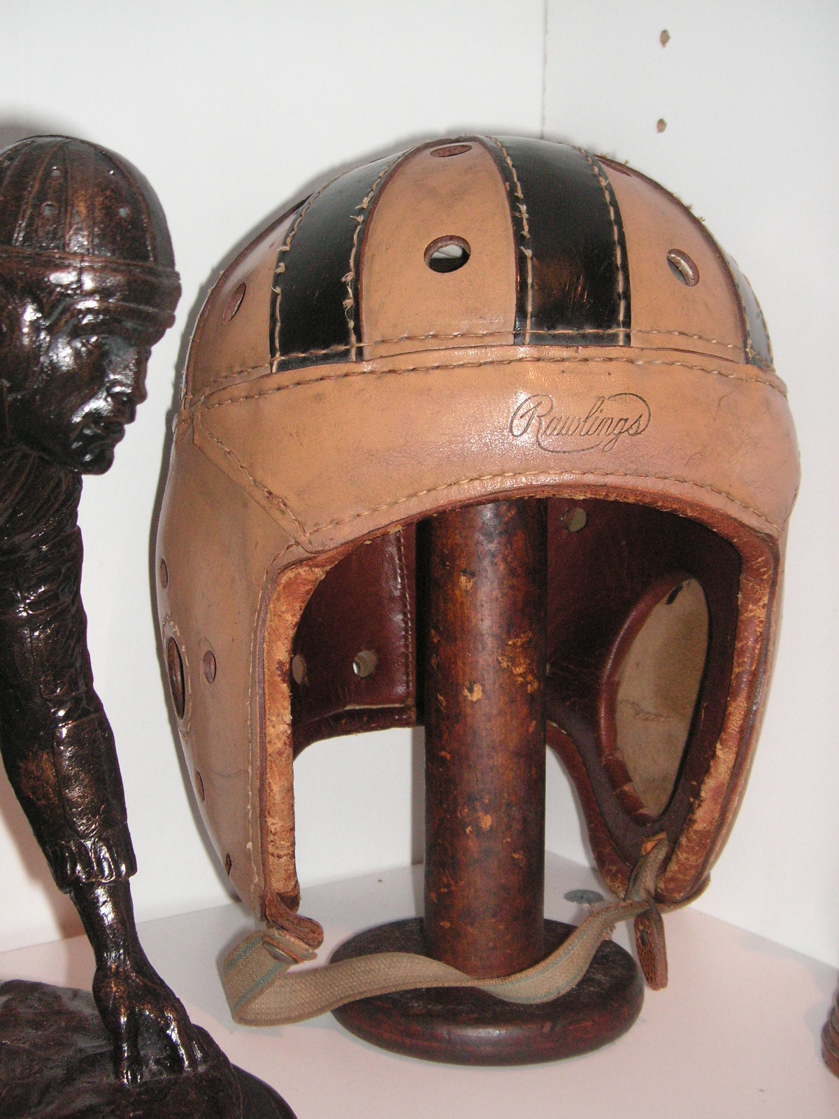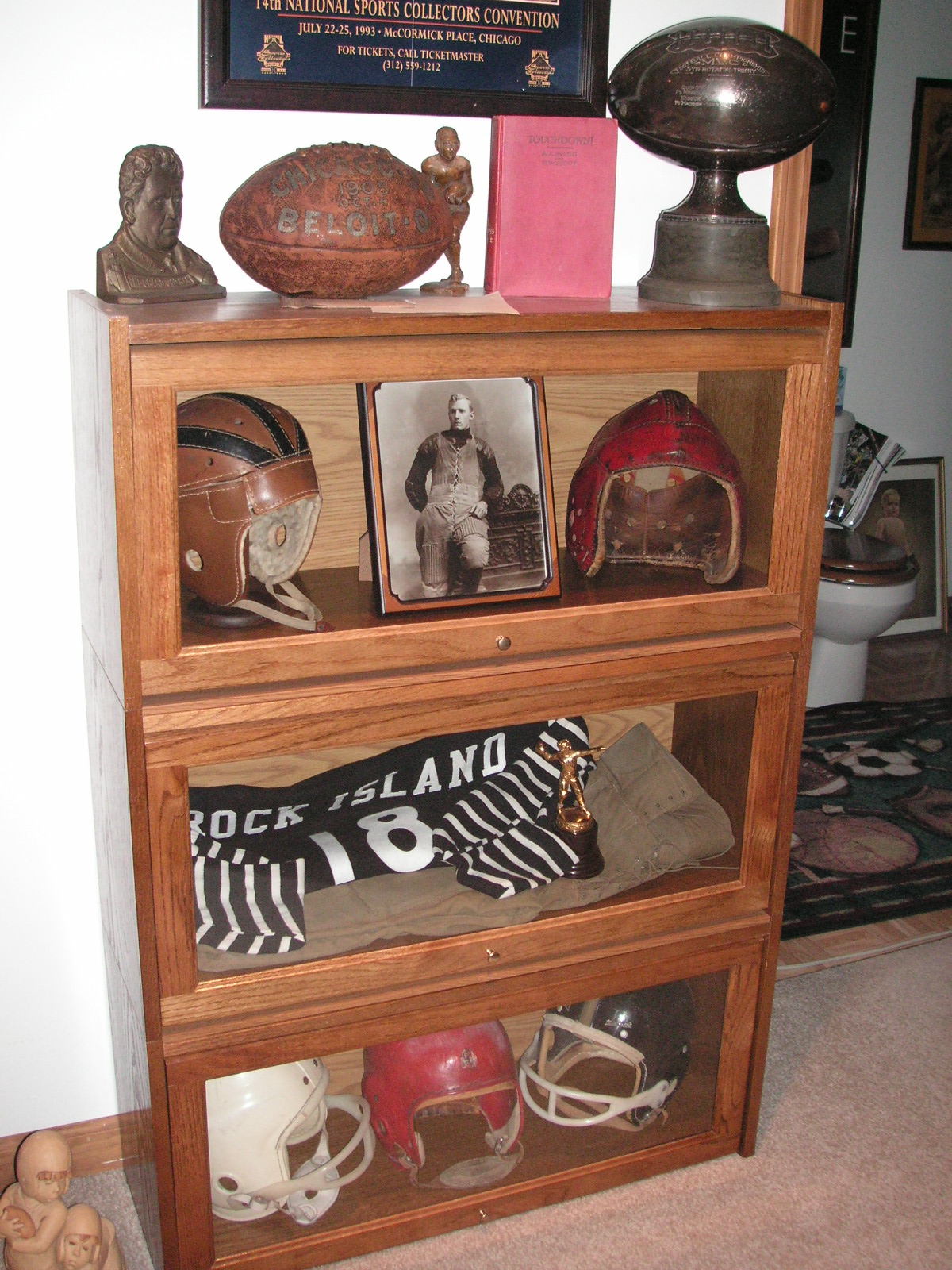 "I've been collecting vintage football items for about 13 years. I started by just wanting 1 leather football helmet. Loving the game of football so much as a player and coach, I was intrigued with the roots of the game. I searched every antique shop I came to with no luck for over a year. My parents found 2 old 1940's leather helmets at an antique shop in Wisconsin and bought them for me for Christmas 13 years ago and that was the start of my obsession. I enjoy having a nice assortment of items that span the decades the game has been played. I often wish I could go back and talk to the men who used to