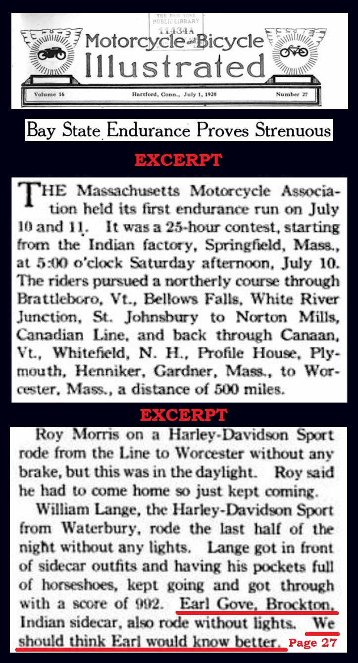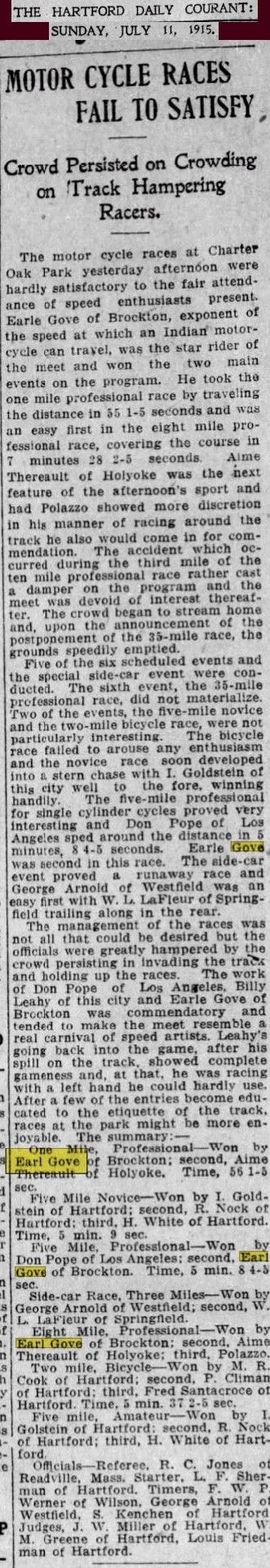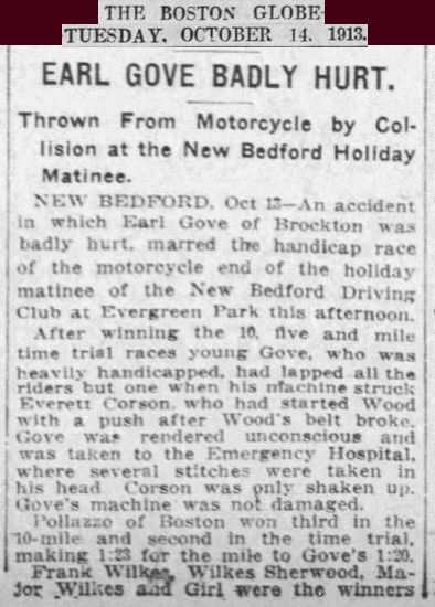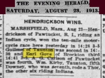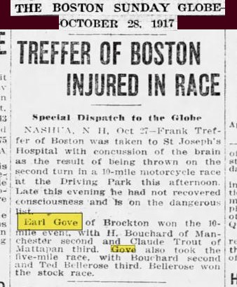 September 12th 1921 in a motorcycle race at Combination Park in the Boston suburb of Medford…I was able to I.D. him by enlarging the photo and reading the engraving on the center trophy…GRAND PRIZE - CLINTON MOTORCYLE RACE MEET – JULY 4TH 1912 – EARL G.