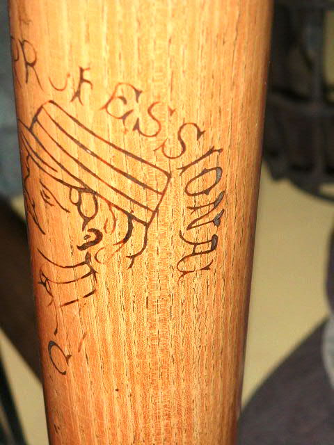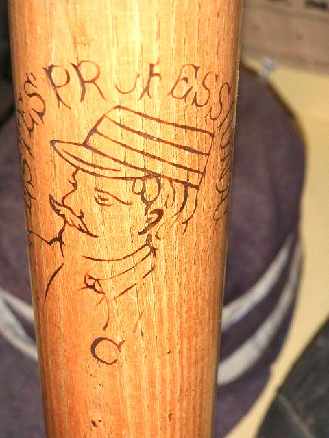So this guy comes up, and I eventually ask him if he has any early bats. And he tells me about this bat that has an old time baseball player with a handlebar moustache, pictured on the barrel. I say well…does it have a flat-ended barrel or rings….no he says, but it’s very early. Well I said, are you interested in selling it? He says yeah he might, so I get his phone number, and eventually call him and go over to his house in Concord California. It was a most interesting visit. I thought I knew who most of the serious collectors were in the San Francisco bay area, so I was surprised when I saw his great collection.