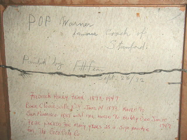 Quite a bit of information, he obviously lived thru the 1906 San Francisco earthquake. We could hardly ask for better background information than this. Quite interesting he worked for Coca Cola for many years! Also it’s interesting he lived in Berkeley, home of the University of California, Stanford’s big game rival, yet for some reason painted Stanford’s coach! The painting measures 10 5/8 inches tall X 8 5/8 inches wide, framed.